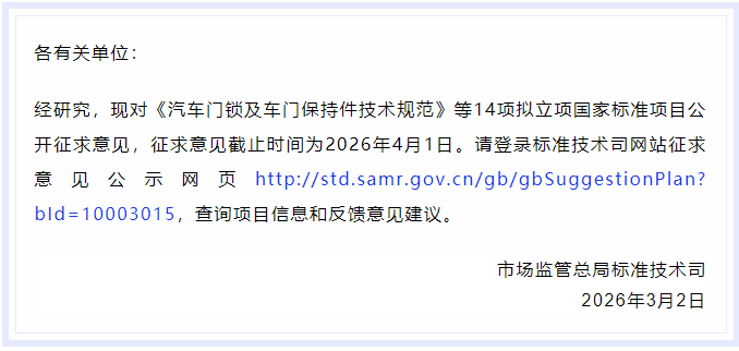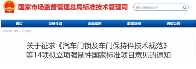 日前,《关于征求〈汽车门锁及车门保持件技术规范〉等14项拟立项强制性国家标准项目意见的通知》正式发布。具体内容如下: